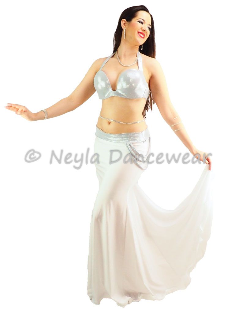 The Delila Costume is the perfect choice for groups looking for a refined, elegant outfit that stands out on any stage. This design features an Egyptian coconut bra and an elastic belt decorated with three strips on the right side, adding a modern and sophisticated touch. The fabric, in a silvery-white tone, shines intensely under the lights, ensuring you and your group dazzle with every movement. 🌟
