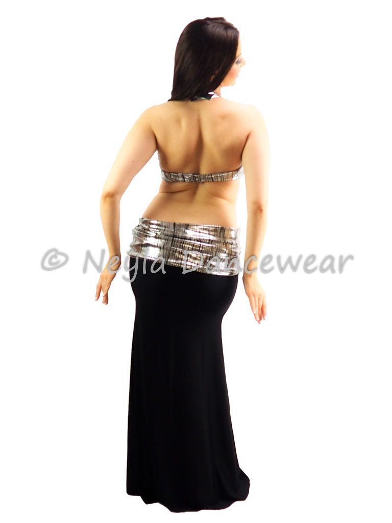 The Inaam Costume is a perfect choice for your students seeking comfort and a striking design in their performances. This set includes an Egyptian coconut bra and a straight, slightly draped elastic sash that easily adapts to different styles and movements. The fabric features a black base with irregular silver stripes that reflect light, adding a sophisticated and modern touch. 🌟