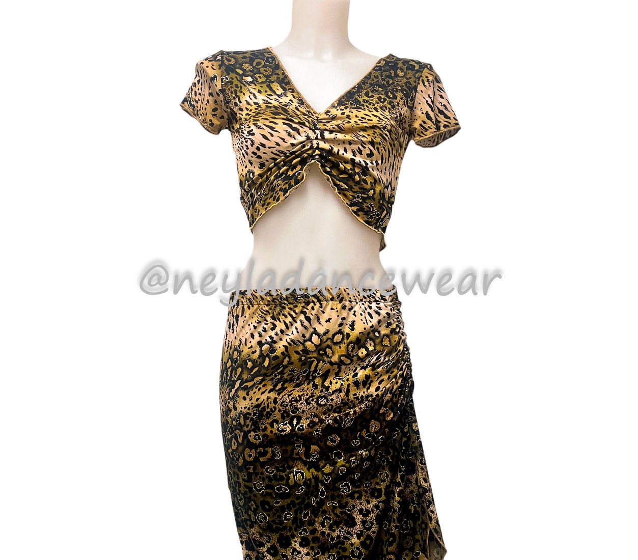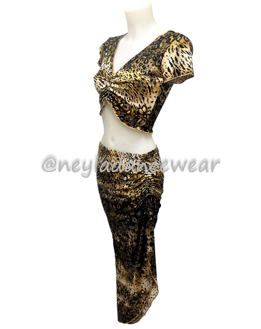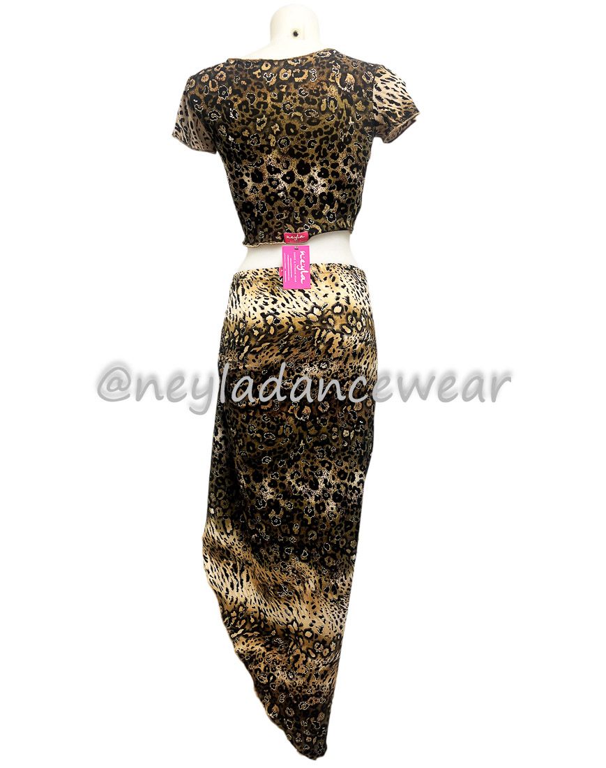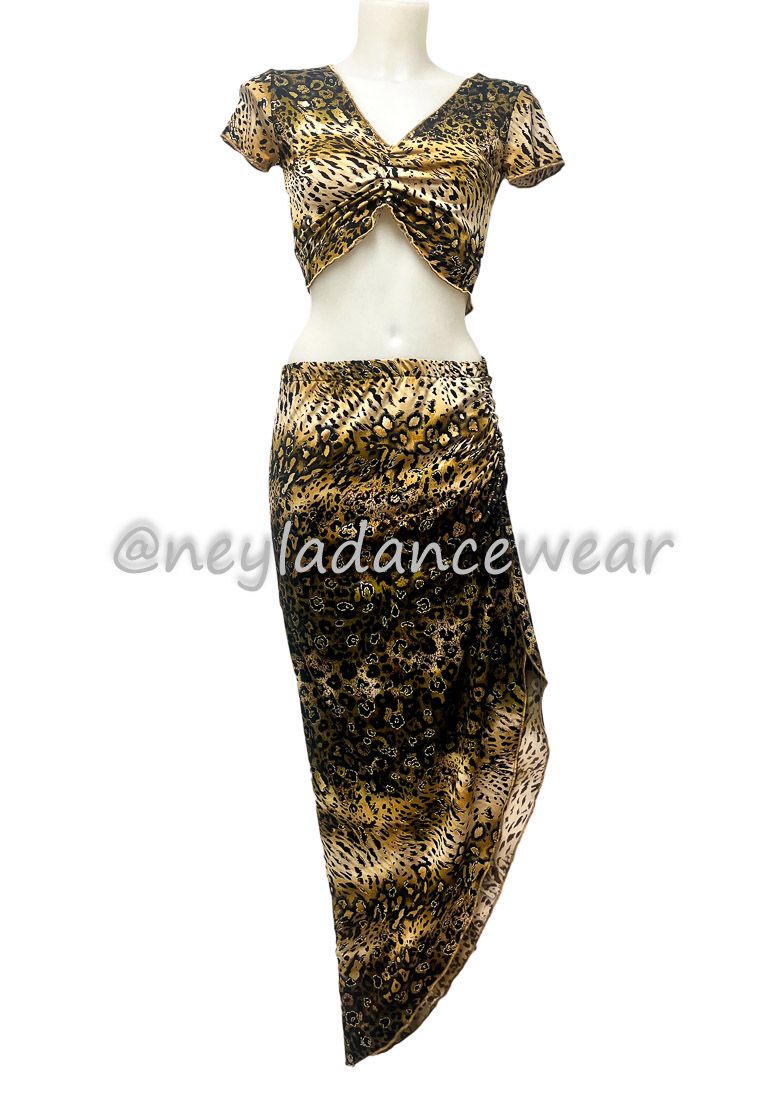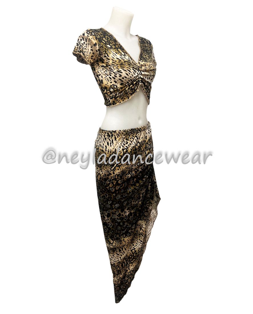 The Khadija Set is designed to flatter your figure and bring a bold, exotic style to your belly dance training. Perfect for standing out in class, this ensemble features an eye-catching animal print in black, brown and gold tones that will turn heads.