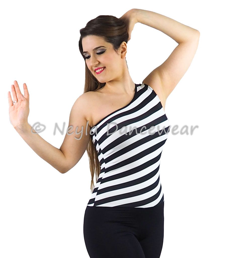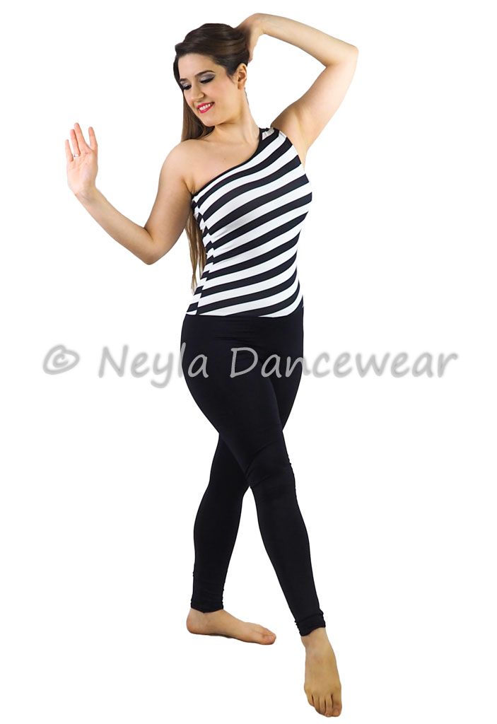 Its unique design features a diagonal neckline that combines a modern white and black diagonal stripe print on the upper part with plain black lycra on the lower half, creating a striking and elegant visual contrast. This combination not only flatters your figure but adds a contemporary and sophisticated touch to your rehearsal wardrobe.
