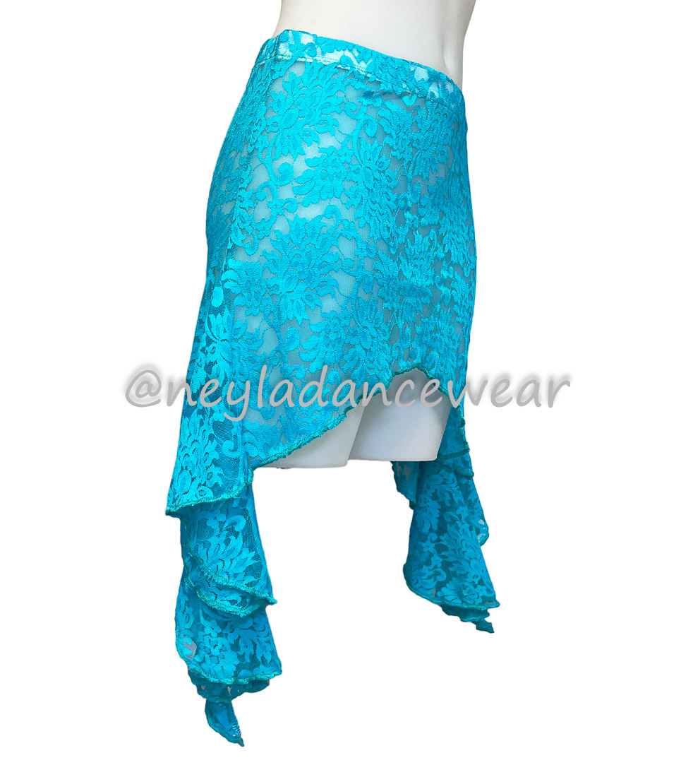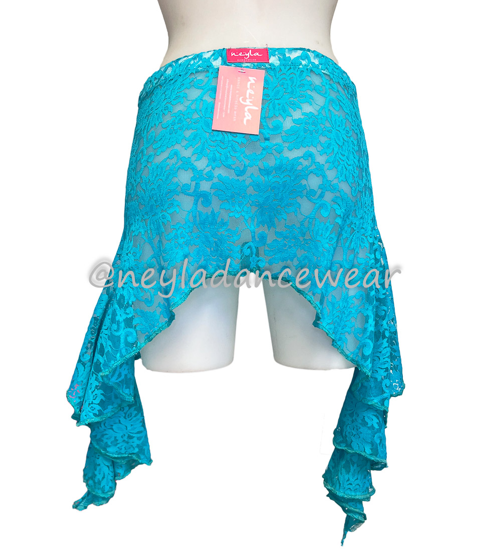 The Shula skirt is a piece full of energy and sophistication, designed to accompany you in your rehearsals, classes, and performances of belly dance, oriental dance, tribal, or modern fusions. Made of stretch turquoise lace, this skirt stands out for its lightness, comfort, and vibrant style that shines on stage.