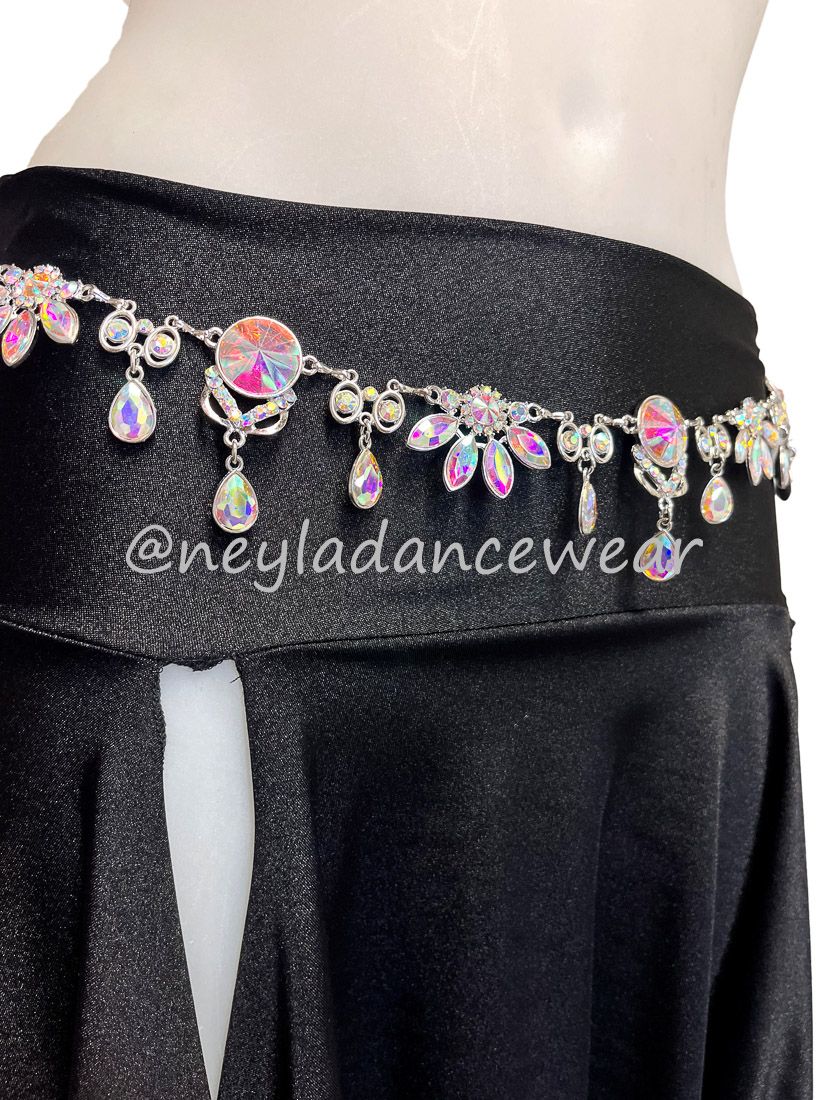 Elle est composée d’éléments en cristal à effet irisé, dans des tons multicolores, disposés dans un design ornemental aux formes florales, avec des gouttes suspendues et des détails circulaires qui captent la lumière sous tous les angles. Sa structure articulée s’adapte en douceur au contour de la taille ou des hanches, et son fermoir réglable permet un usage polyvalent et confortable.