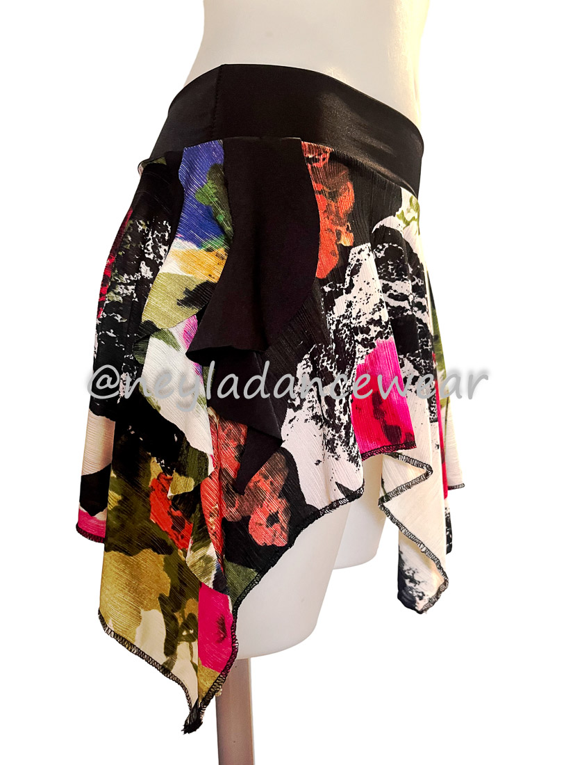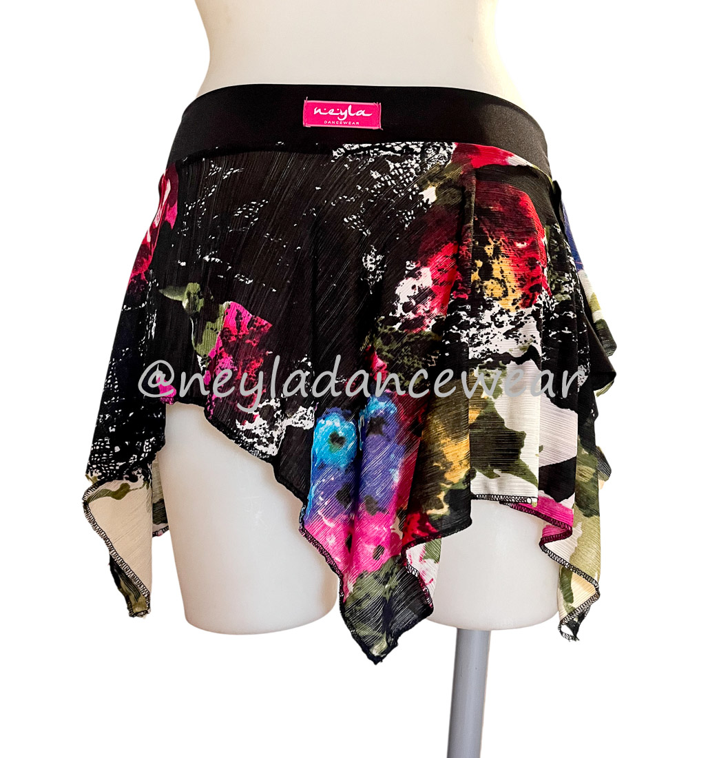 La Fatma associe une large ceinture noire, assurant un ajustement confortable et flatteur, à un imprimé floral multicolore mêlant des tons vibrants comme le fuchsia, le vert, le bleu électrique, avec des détails en noir et blanc. Ce contraste coloré crée un effet visuel éclatant, idéal pour briller sur scène ou en répétition.