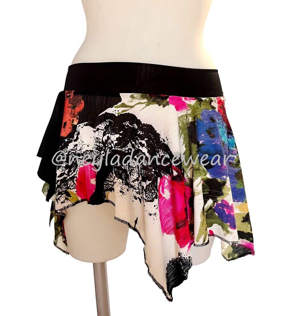 La jupe Fatma est une pièce polyvalente et captivante, conçue pour vous accompagner lors de vos cours et représentations de danse orientale, danse du ventre, tribal ou fusions modernes. Confectionnée dans un tissu léger à la chute fluide, elle se distingue par sa coupe asymétrique en pointes qui apporte dynamisme et mouvement à chacun de vos pas.