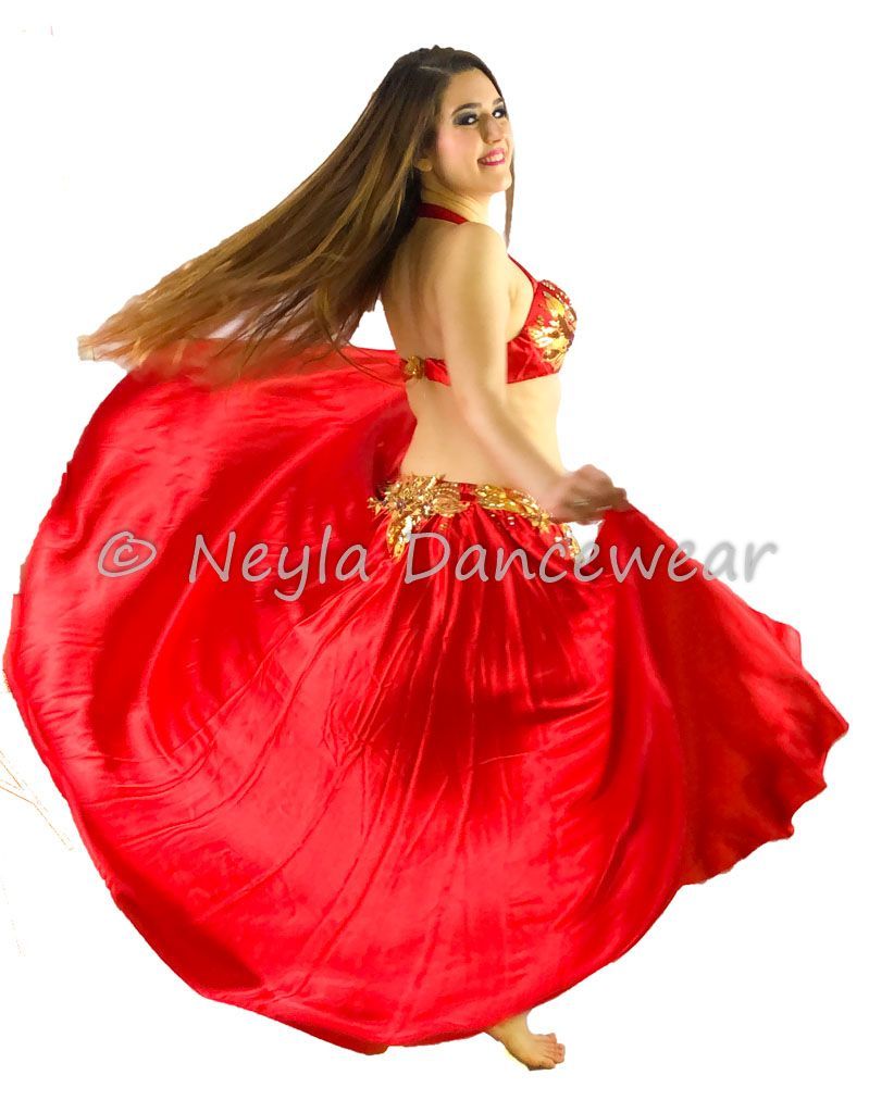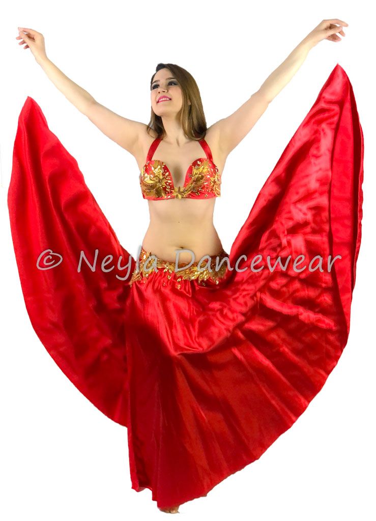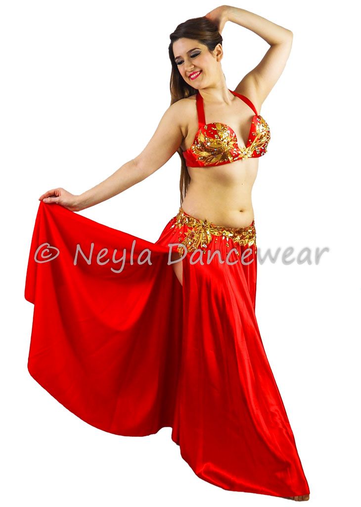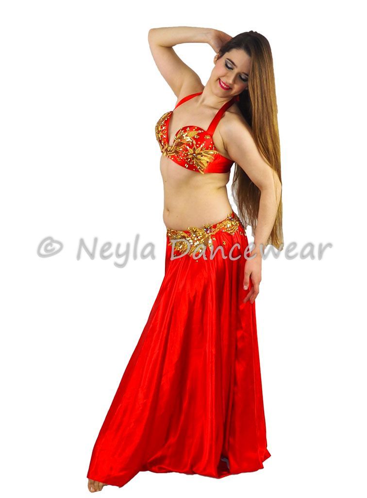 L’ensemble comprend un soutien-gorge coco égyptien doublé en satin rouge, offrant brillance et confort. La jupe unie, également en satin rouge, s’harmonise parfaitement avec le soutien-gorge et présente une fente élégante sur la jambe droite qui ajoute mobilité et une touche de sensualité.