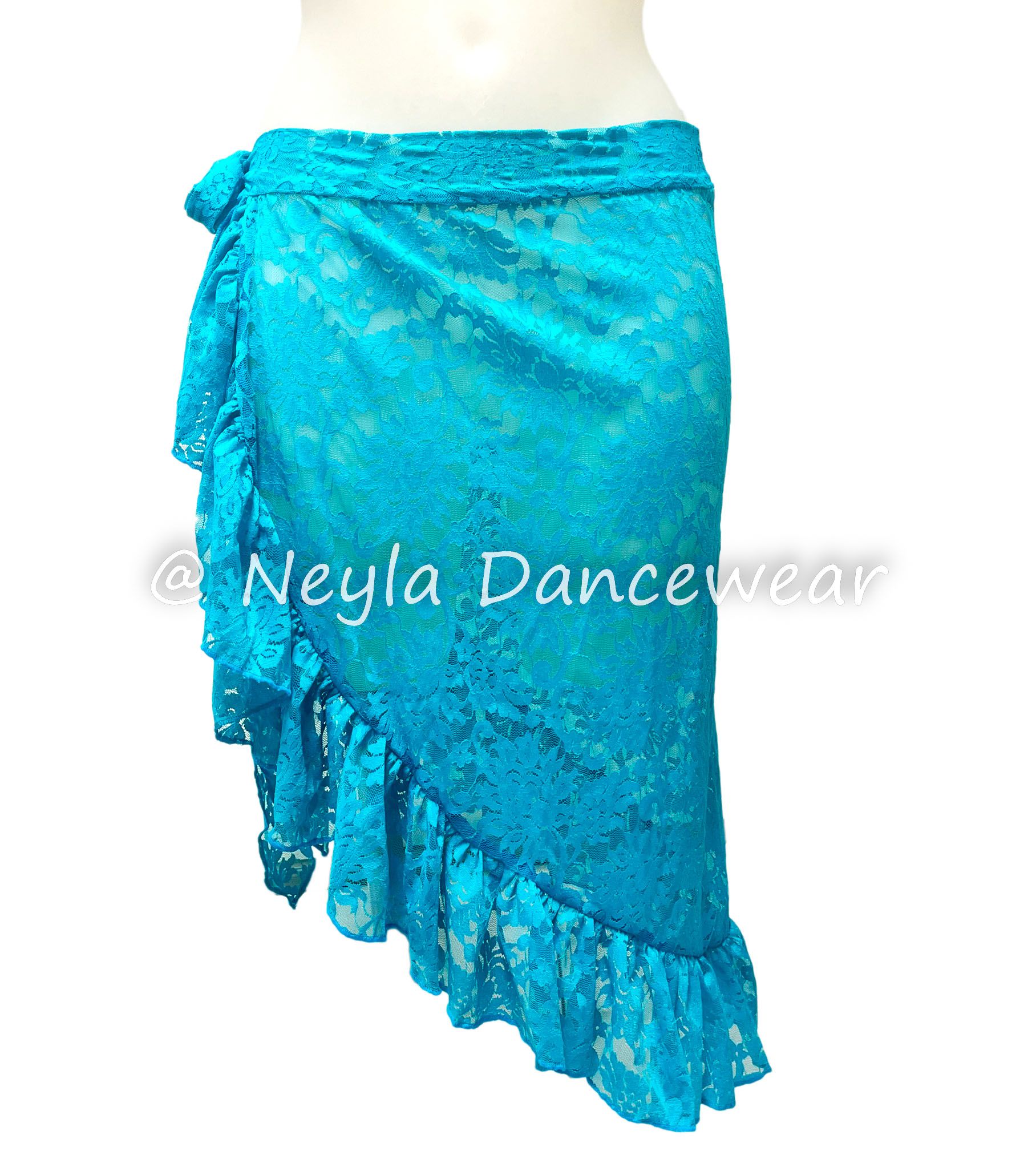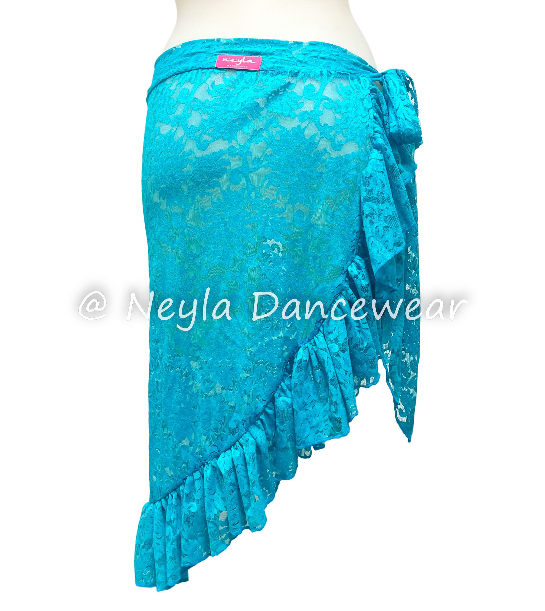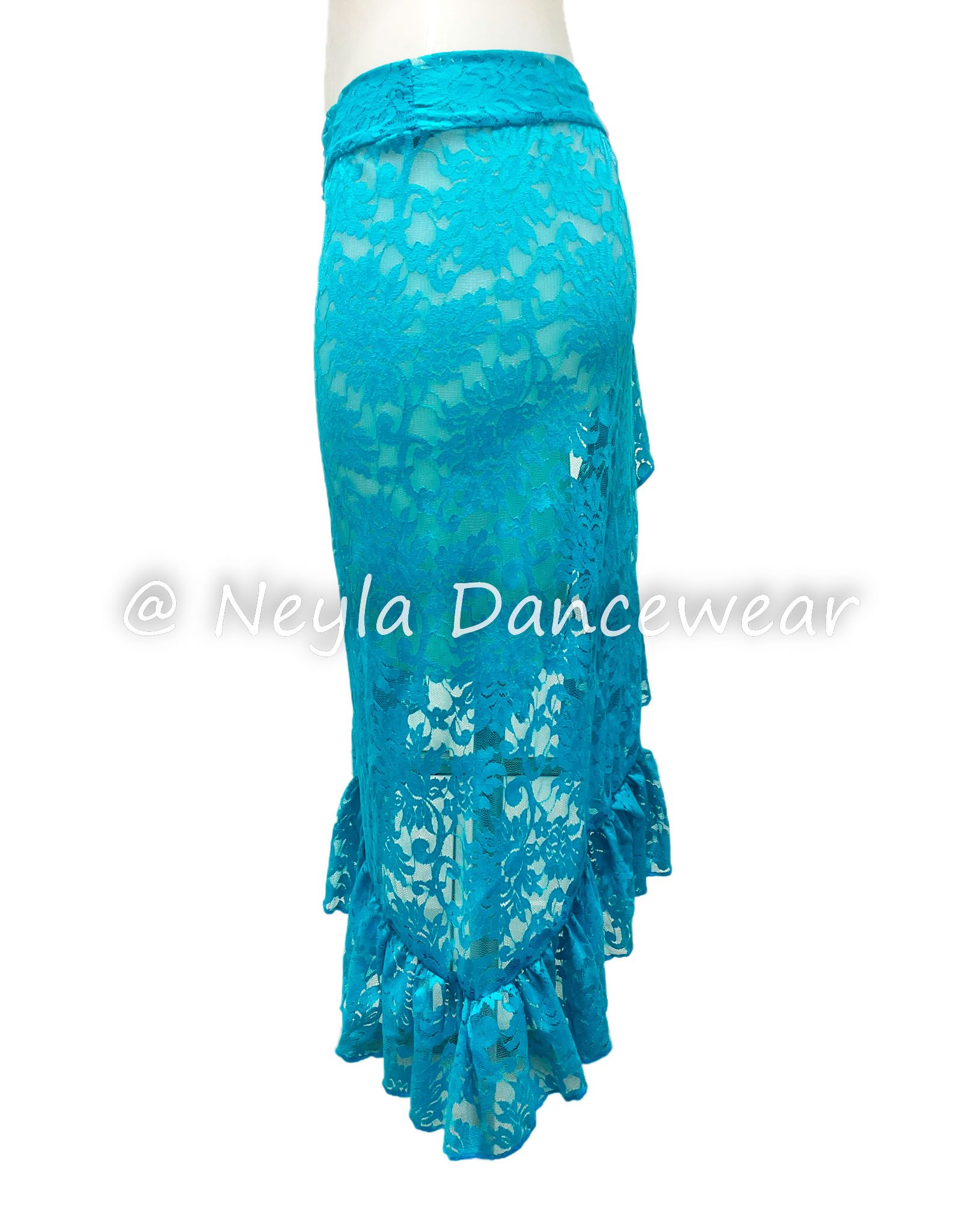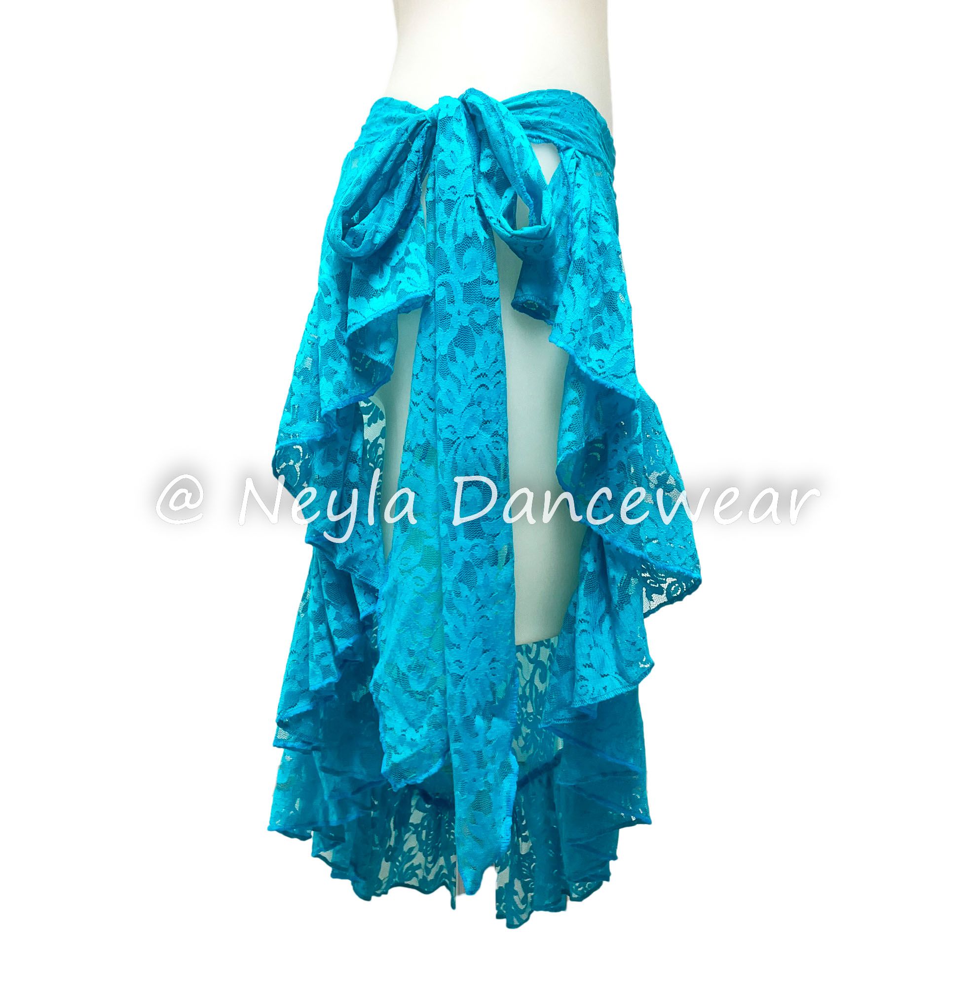 La Falda Abil está pensada para quienes quieren brillar con un estilo original y sofisticado en sus clases o actuaciones de danza del vientre, tribal, fusiones o bollywood. Su diseño tipo pareo con encaje en color verde aguamarina transmite frescura y alegría, mientras que el volante en el bajo añade movimiento y gracia a cada giro, resaltando la feminidad de tus pasos.