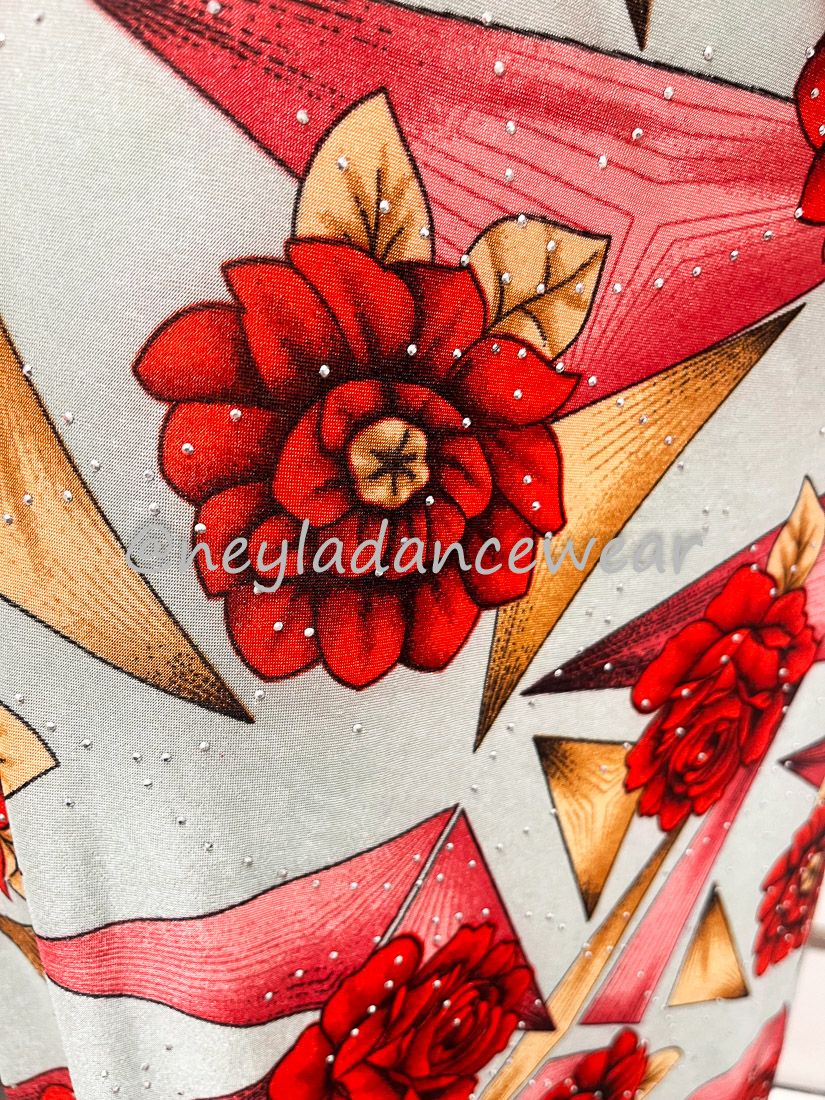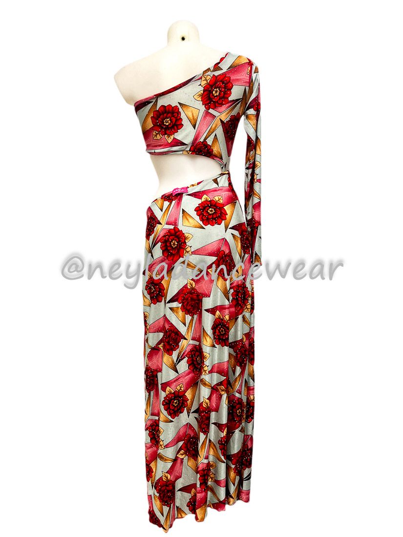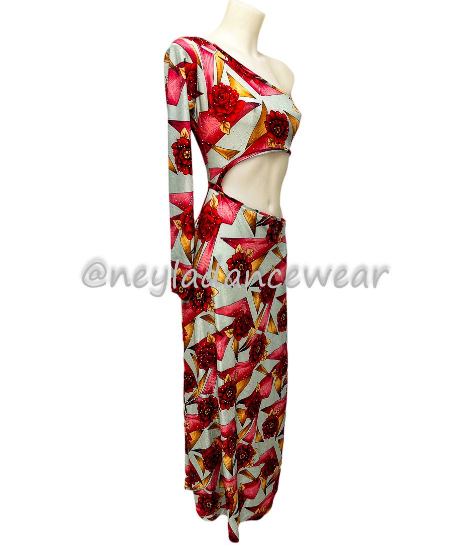 Su patrón estampado en tonos rojos, grises y azules, con motivos florales y detalles geométricos, está enriquecido con pedrería incrustada para ofrecer un toque de brillo y sofisticación en cada giro y ondulación. El corte asimétrico en el escote resalta el torso con sensualidad y elegancia: un hombro al descubierto y una manga larga en el otro para un contraste teatral y muy favorecedor.