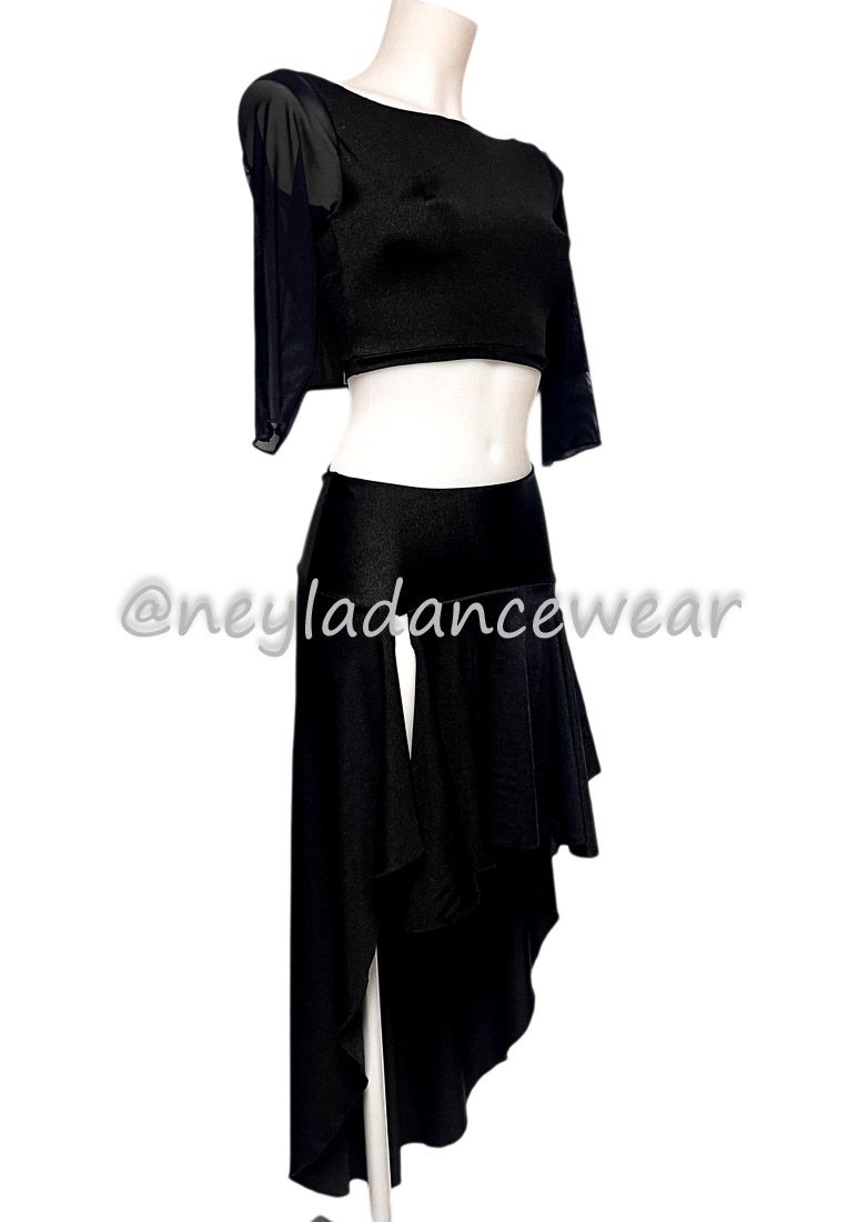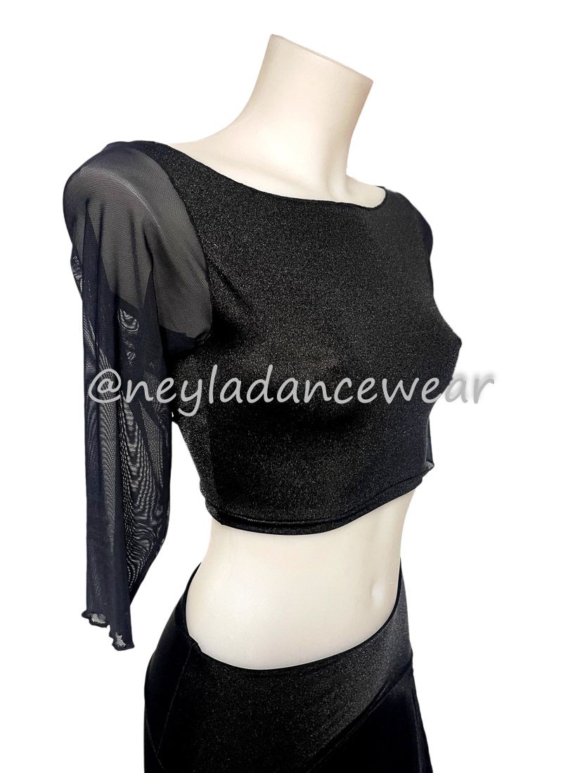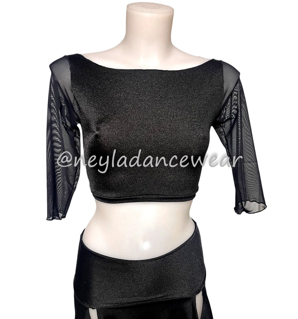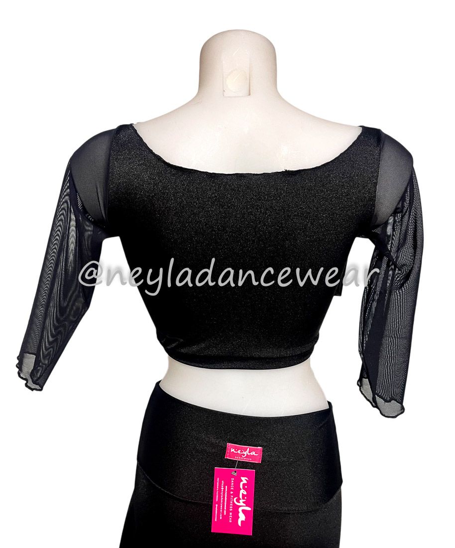 El top Batula combina la suavidad de la lycra con la delicadeza del tul, creando una prenda elegante y funcional para bailarinas de danza del vientre y otros estilos. Su diseño corto, que llega justo debajo del pecho, y sus mangas 3/4 de tul añaden un toque femenino y sofisticado, ideal para quienes buscan destacar en cada movimiento. Este top negro ha sido diseñado para ofrecer comodidad, estilo y total libertad de movimiento, convirtiéndose en una pieza esencial para tu guardarropa de baile.