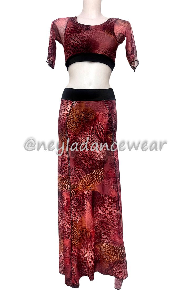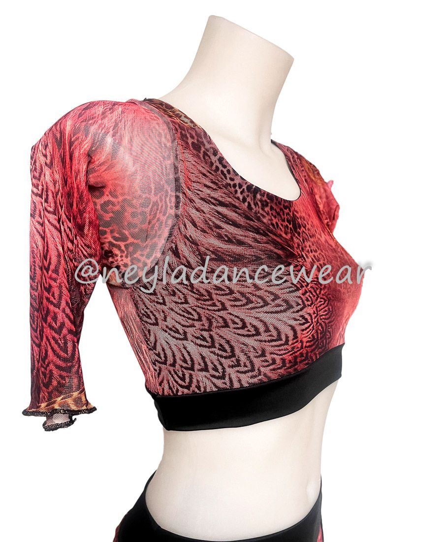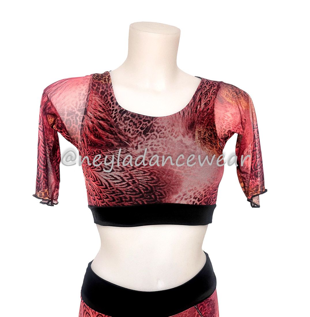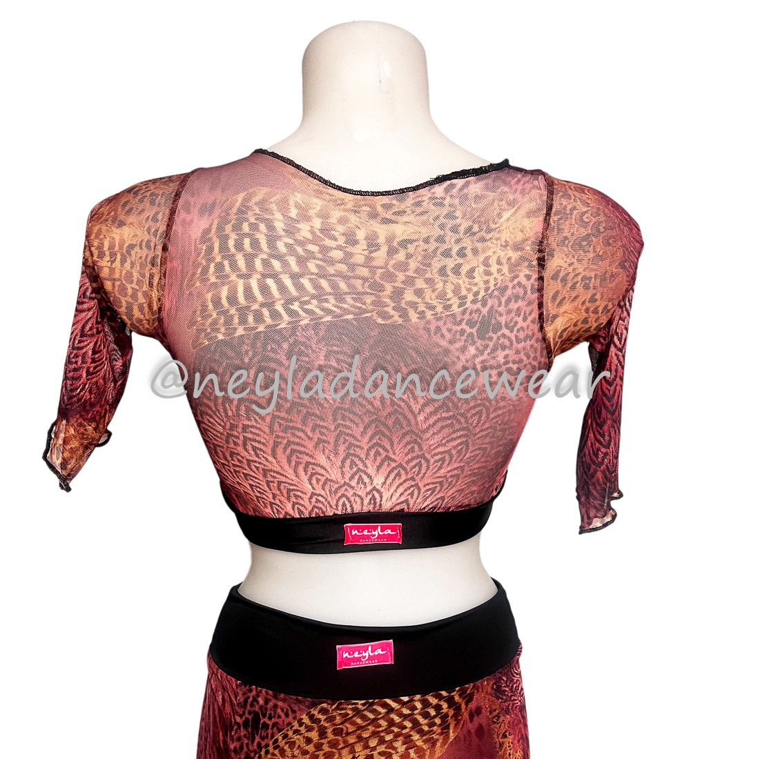 Confeccionado en un tejido ligero y semitransparente, permite una libertad de movimiento absoluta, resaltando la fluidez y la gracia que caracterizan a la danza oriental. Su impresionante estampado de plumas en tonos cálidos y terrosos aporta un toque exótico y llamativo, convirtiéndolo en una prenda única y sofisticada. Además, su textura suave garantiza un ajuste cómodo que se adapta perfectamente al cuerpo.