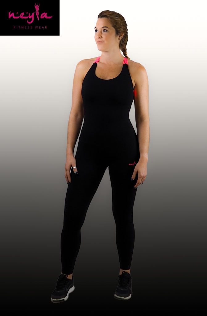 Este mono presenta un diseño ceñido en color negro con detalles en rosa neón que destacan en las tiras cruzadas de la espalda y en el bajo, aportando un toque moderno y dinámico. Su corte ergonómico garantiza un ajuste perfecto que realza la silueta y permite total libertad de movimiento, ideal para cualquier tipo de actividad física.