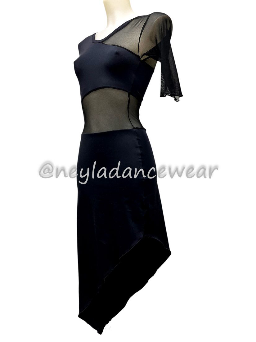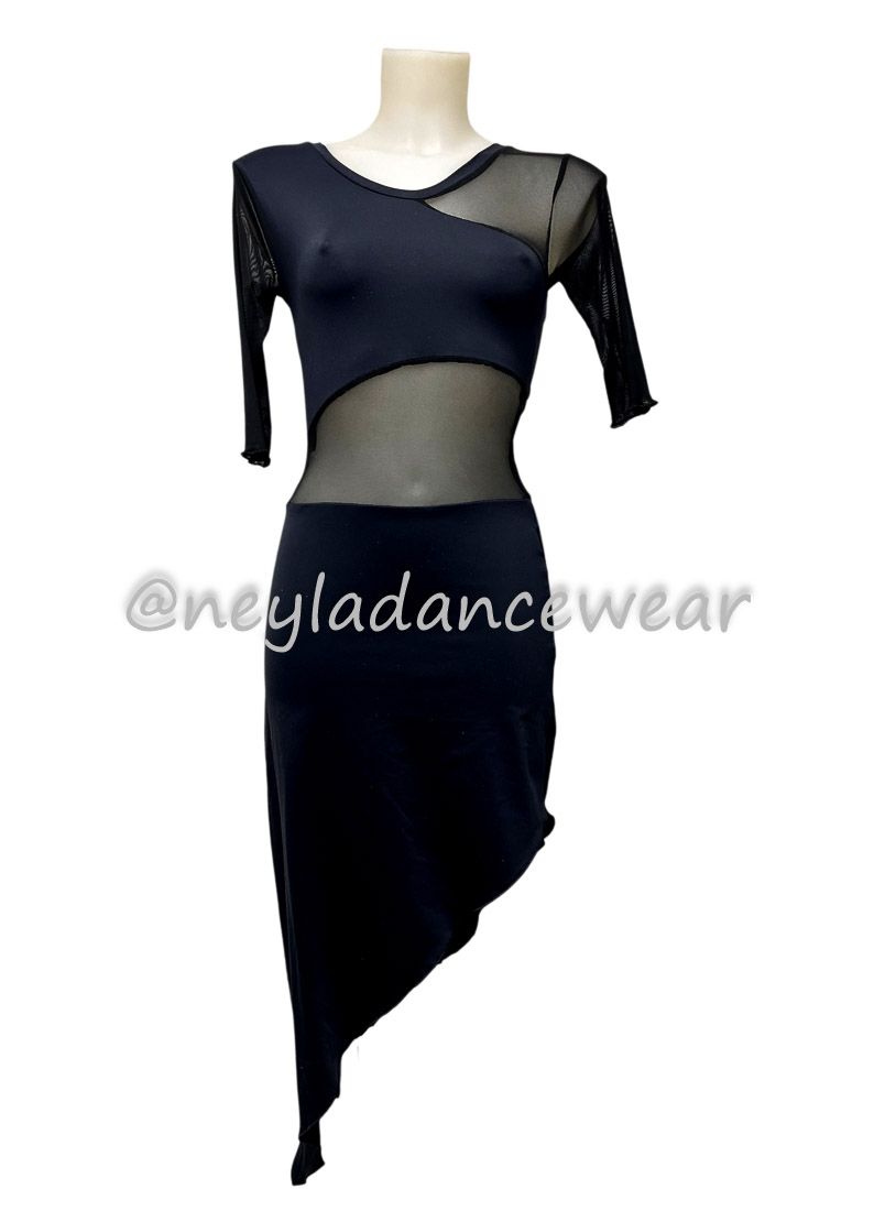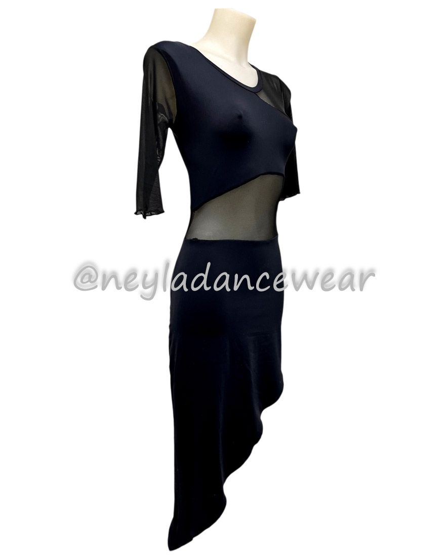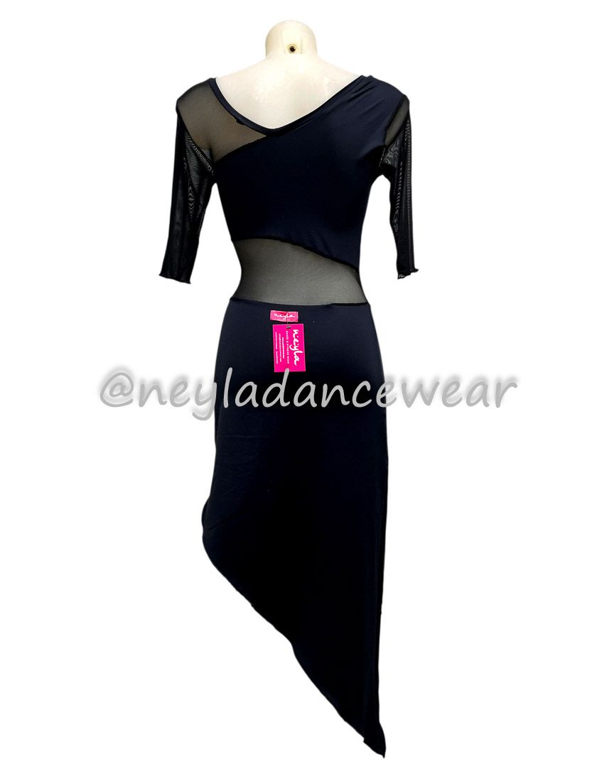 Su escote redondo con mangas tres cuartos en tul negro aporta sofisticación y ligereza, dejando entrever la piel de forma sutil para un efecto elegante y misterioso. La cintura con panel de tul transparente estiliza la silueta mientras te brinda libertad de movimiento. La falda asimétrica en lycra negra cae con suavidad y gracia, acompañando cada giro, ondulación o shimmy con un movimiento fluido y cautivador.