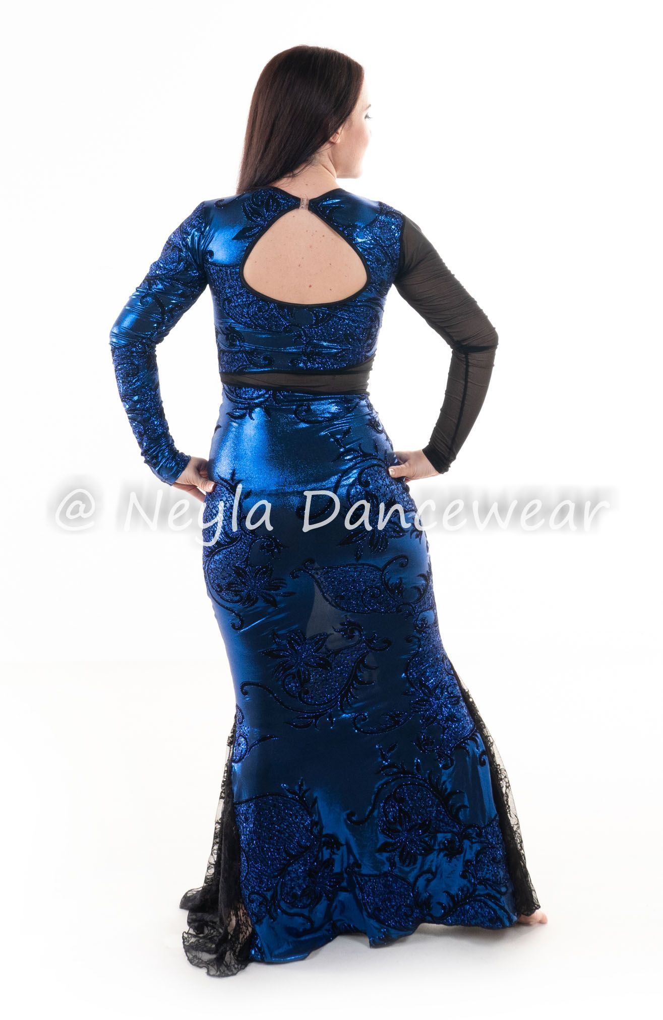 Confeccionado en una espectacular tela azul eléctrico con decoraciones de terciopelo negro y destellos de purpurina, Kalila aporta luz y elegancia en escena. El tul negro estratégicamente colocado en mangas y cintura le suma un toque sofisticado y equilibrado.