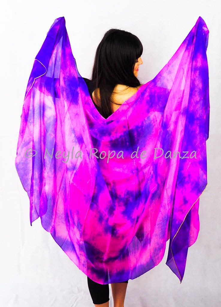 El Velo de Seda con Manchas Tie-Dye en vibrantes tonos fucsia y morado oscuro es un accesorio que combina expresión artística y elegancia para tus ensayos y actuaciones de danza del vientre y danza oriental. Confeccionado con seda de alta calidad, este velo ofrece una caída ligera y fluida que realza cada movimiento con estilo y vitalidad.
